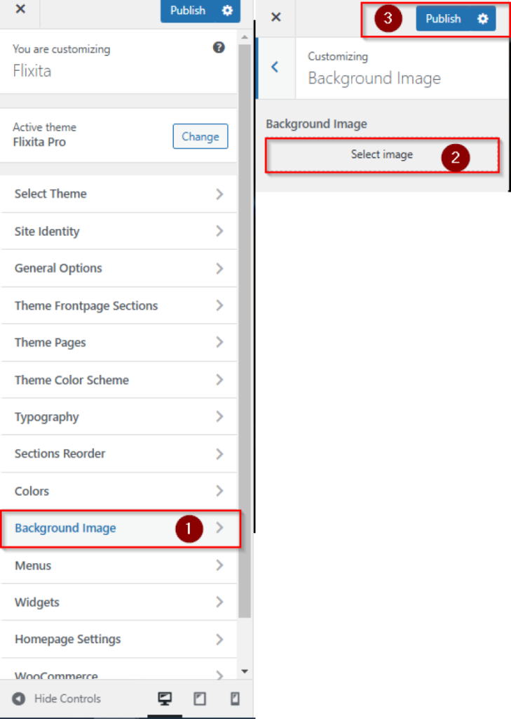 Log in to your WordPress Dashboard In the left-hand menu >> hover over Appearance and click on Customize >> look for the Background Image option in the left-hand menu >> Select Image and go to Publish.