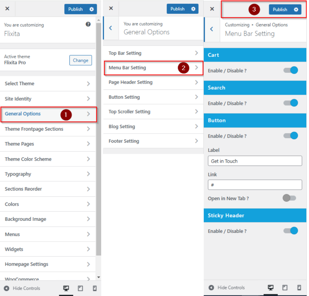 Navigate to your admin Dashboard Appearance >> Customize >> Genral Option >> Menu Bar Setting >> set the Enable and Disable option>> Click on Publish Button.