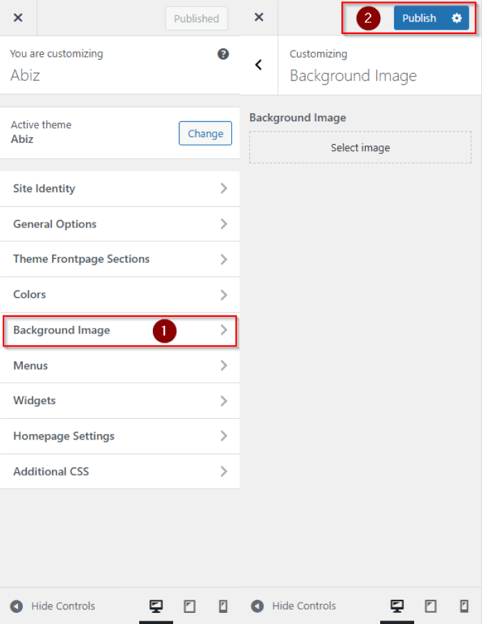Navigate to your admin Dashboard In the left-hand menu >> Hover over Appearance and click on Customize >> Background Image >> Click on Publish Button.