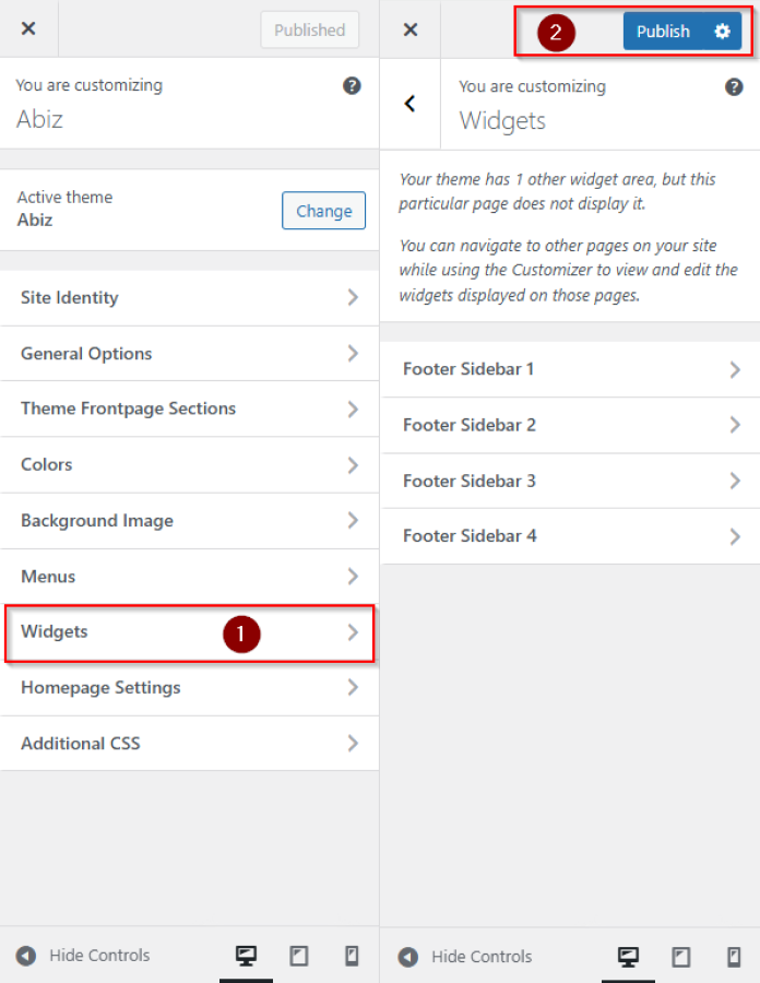 Navigate to your admin Dashboard In the left-hand menu >> Hover over Appearance and click on Customize >> Widgets Footer Sidebar >> Click on Publish Button.