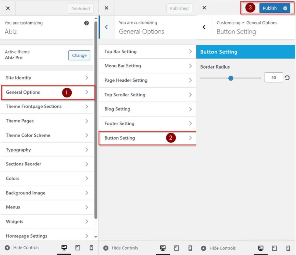 Navigate to your admin Dashboard In the left-hand menu >> Hover over Appearance and click on Customize >> Genral Option >> Button Setting >> Click on Publish Button.