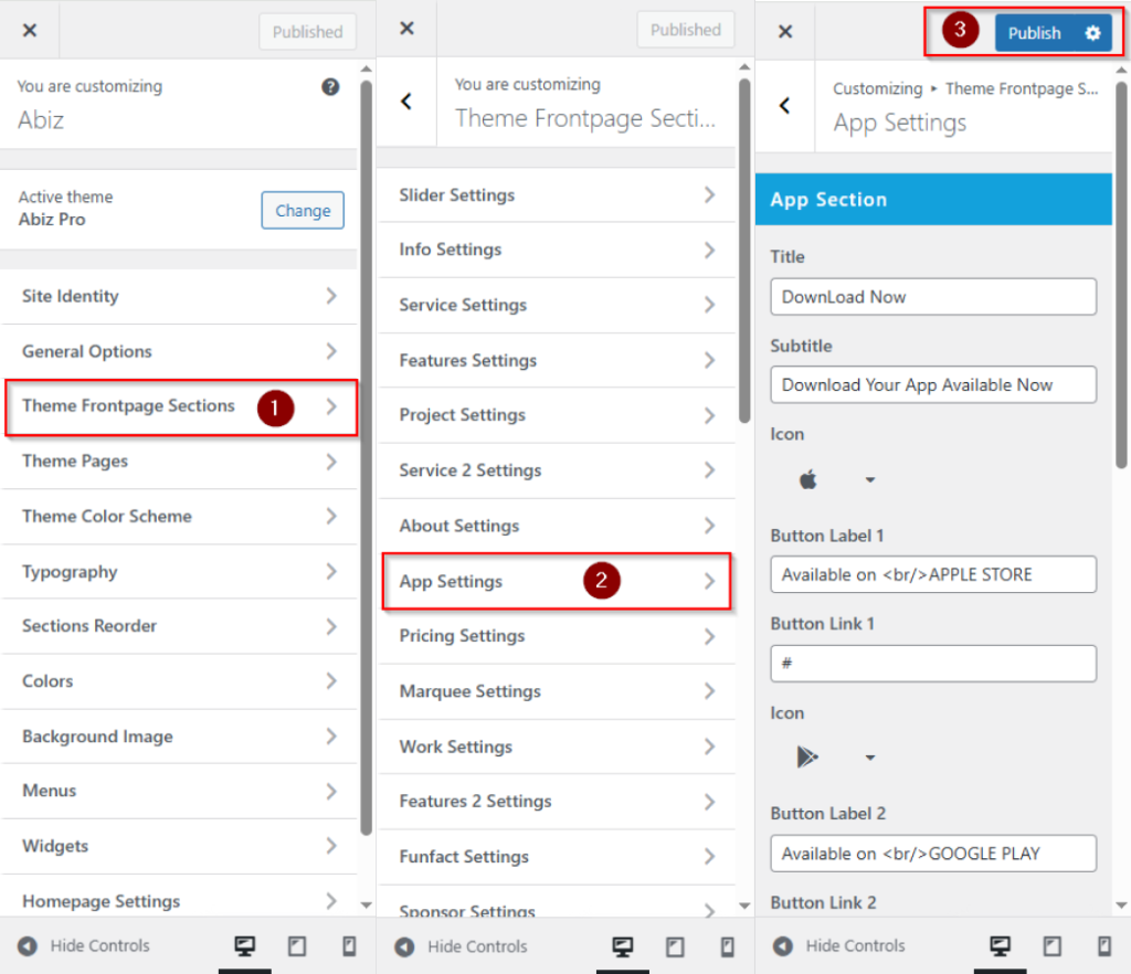 Log in to your WordPress Dashboard In the left-hand menu >> hover over Appearance and click on Customize >> look for the Theme Frontpage Sections option in the left-hand menu >> Under App Settings >> then Publish button.
