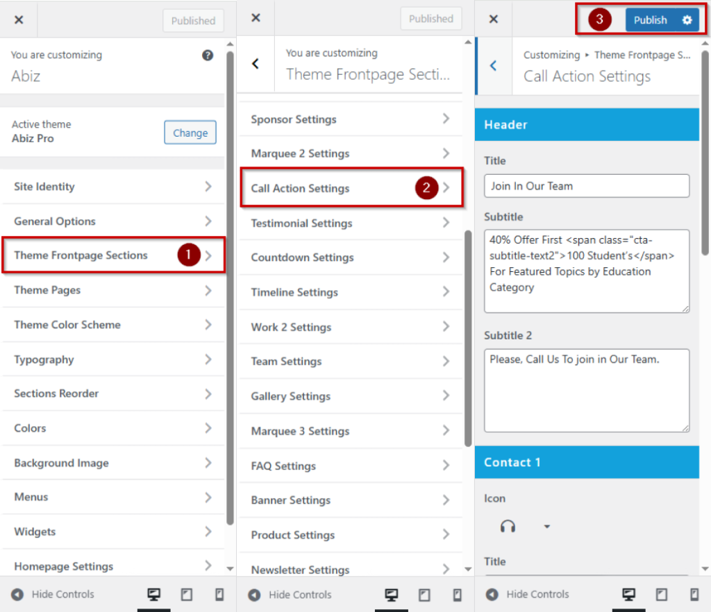 Log in to your WordPress Dashboard In the left-hand menu >> hover over Appearance and click on Customize >> look for the Theme Frontpage Sections option in the left-hand menu >> Under Call Action Settings >> then Publish button.