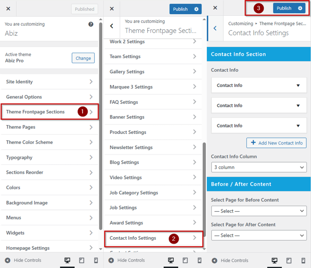 Log in to your WordPress Dashboard In the left-hand menu >> hover over Appearance and click on Customize >> look for the Theme Frontpage Sections option in the left-hand menu >> Under Contact Info Settings >> then Publish button.