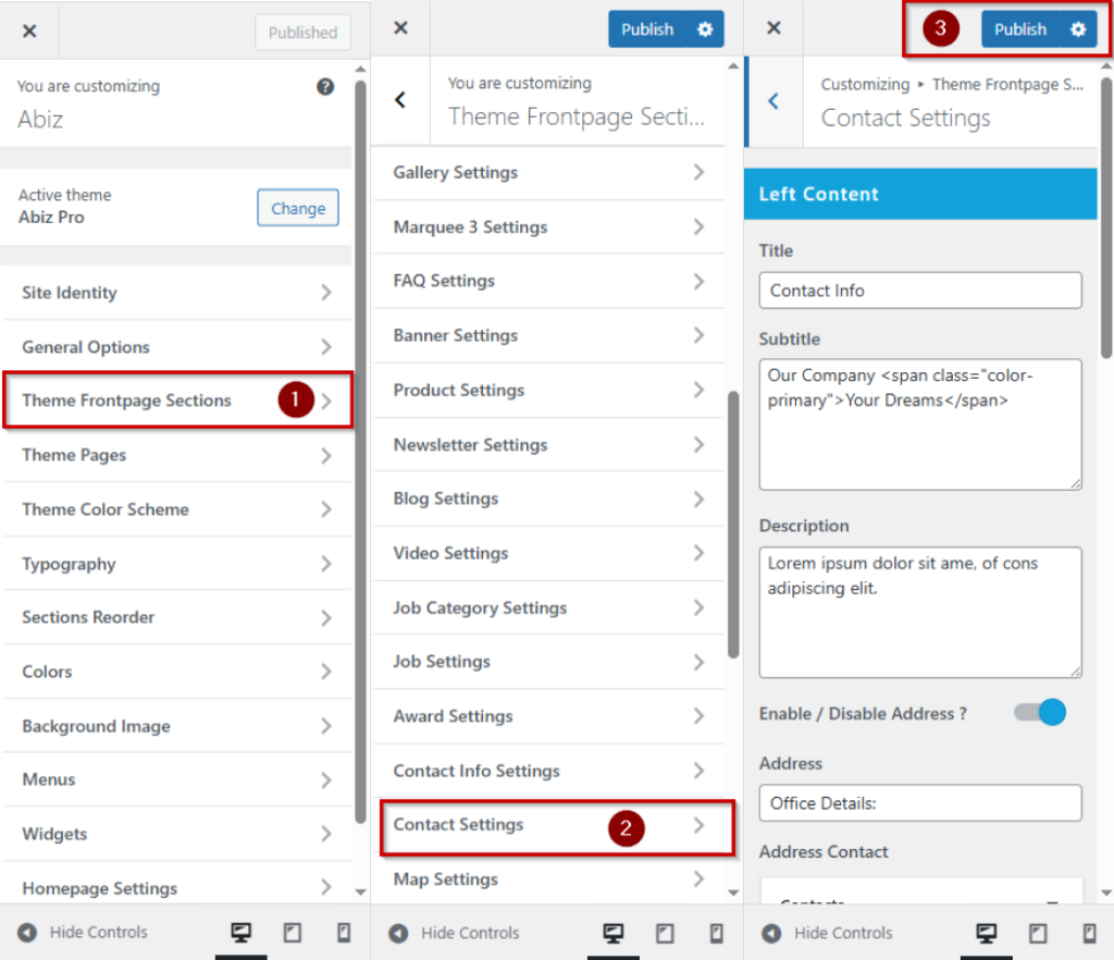 Log in to your WordPress Dashboard In the left-hand menu >> hover over Appearance and click on Customize >> look for the Theme Frontpage Sections option in the left-hand menu >> Under Contact Settings >> then Publish button.