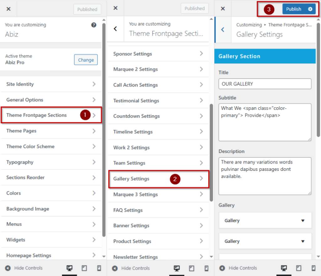 Log in to your WordPress Dashboard In the left-hand menu >> hover over Appearance and click on Customize >> look for the Theme Frontpage Sections option in the left-hand menu >> Under Gallery Settings >> then Publish button.