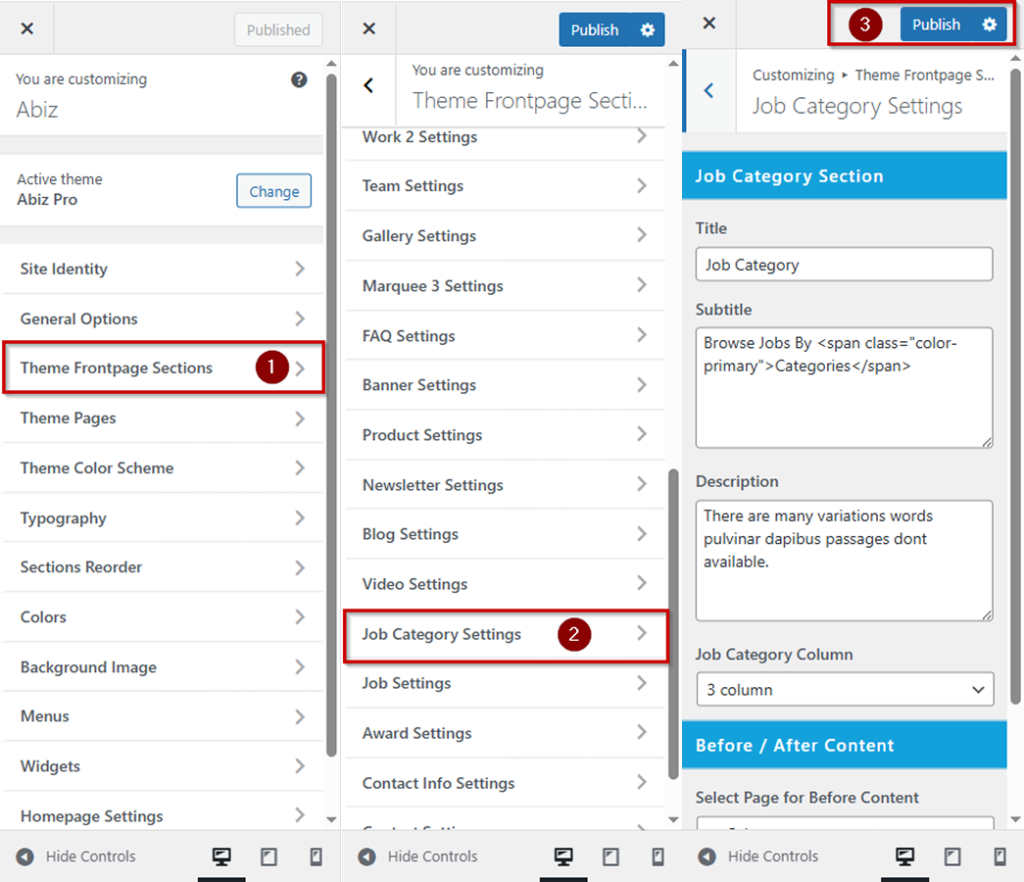 Log in to your WordPress Dashboard In the left-hand menu >> hover over Appearance and click on Customize >> look for the Theme Frontpage Sections option in the left-hand menu >> Under Job Category Settings >> then Publish button.