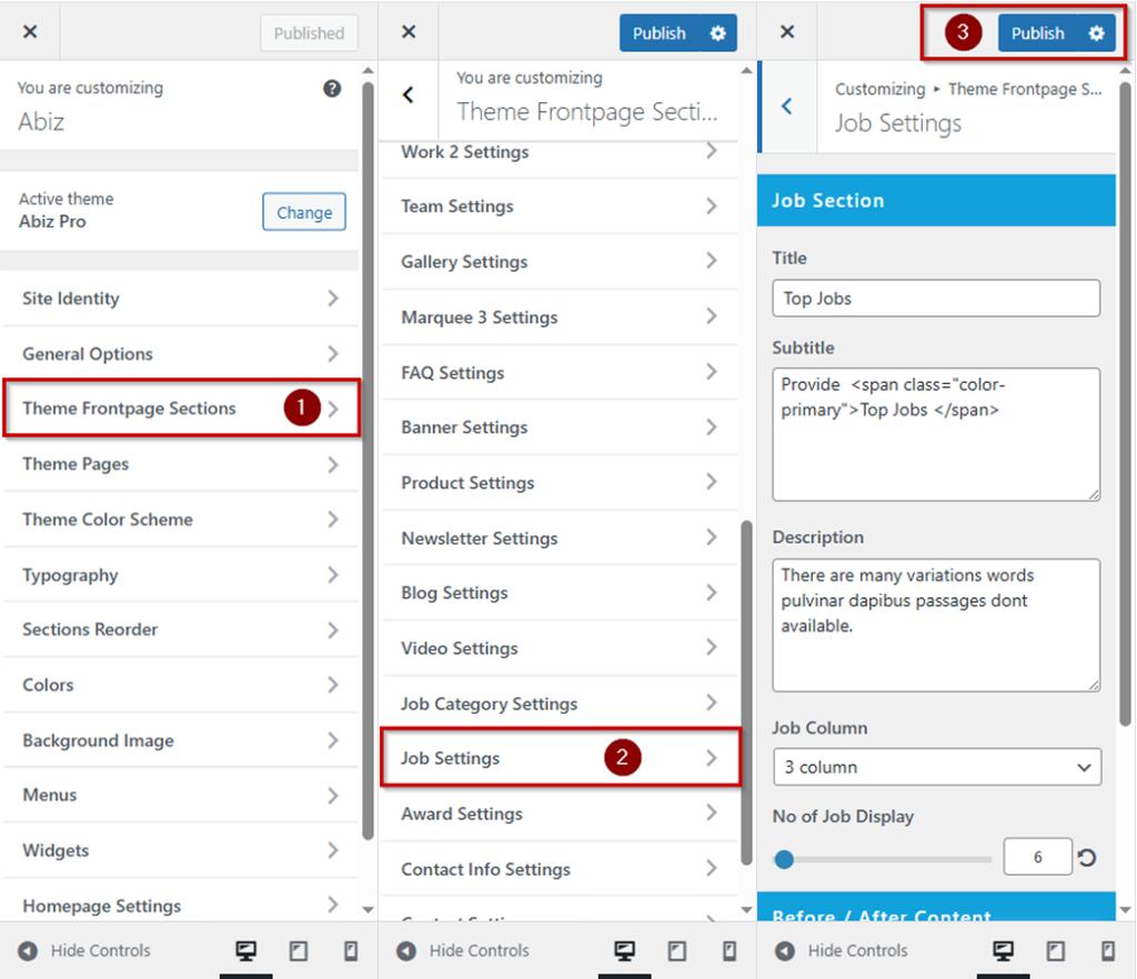 Log in to your WordPress Dashboard In the left-hand menu >> hover over Appearance and click on Customize >> look for the Theme Frontpage Sections option in the left-hand menu >> Under Job Settings >> then Publish button.
