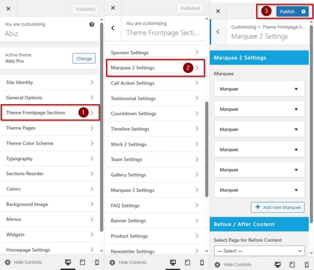 Log in to your WordPress Dashboard In the left-hand menu >> hover over Appearance and click on Customize >> look for the Theme Frontpage Sections option in the left-hand menu >> Under Marquee 2 Settings >> then Publish button.