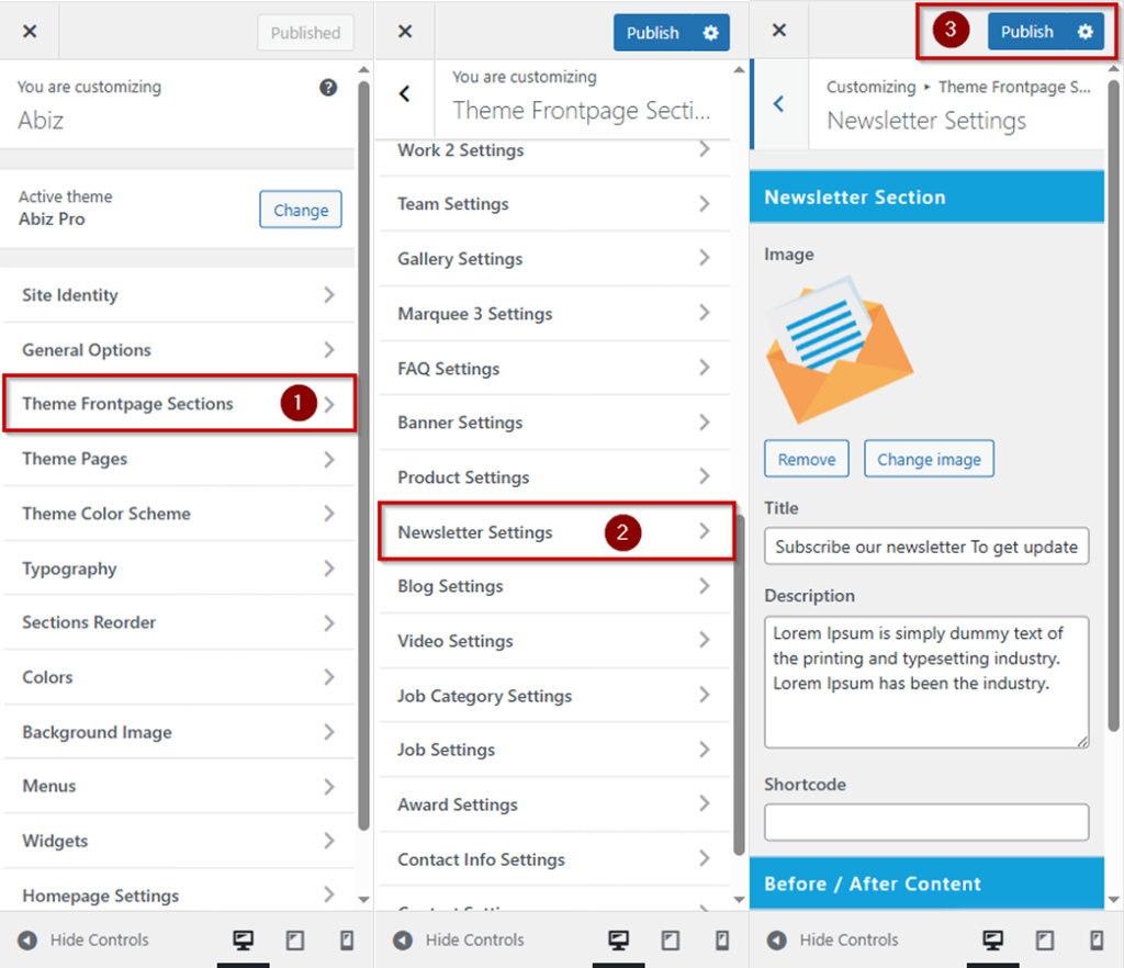 Log in to your WordPress Dashboard In the left-hand menu >> hover over Appearance and click on Customize >> look for the Theme Frontpage Sections option in the left-hand menu >> Under Newsletter Settings >> then Publish button.