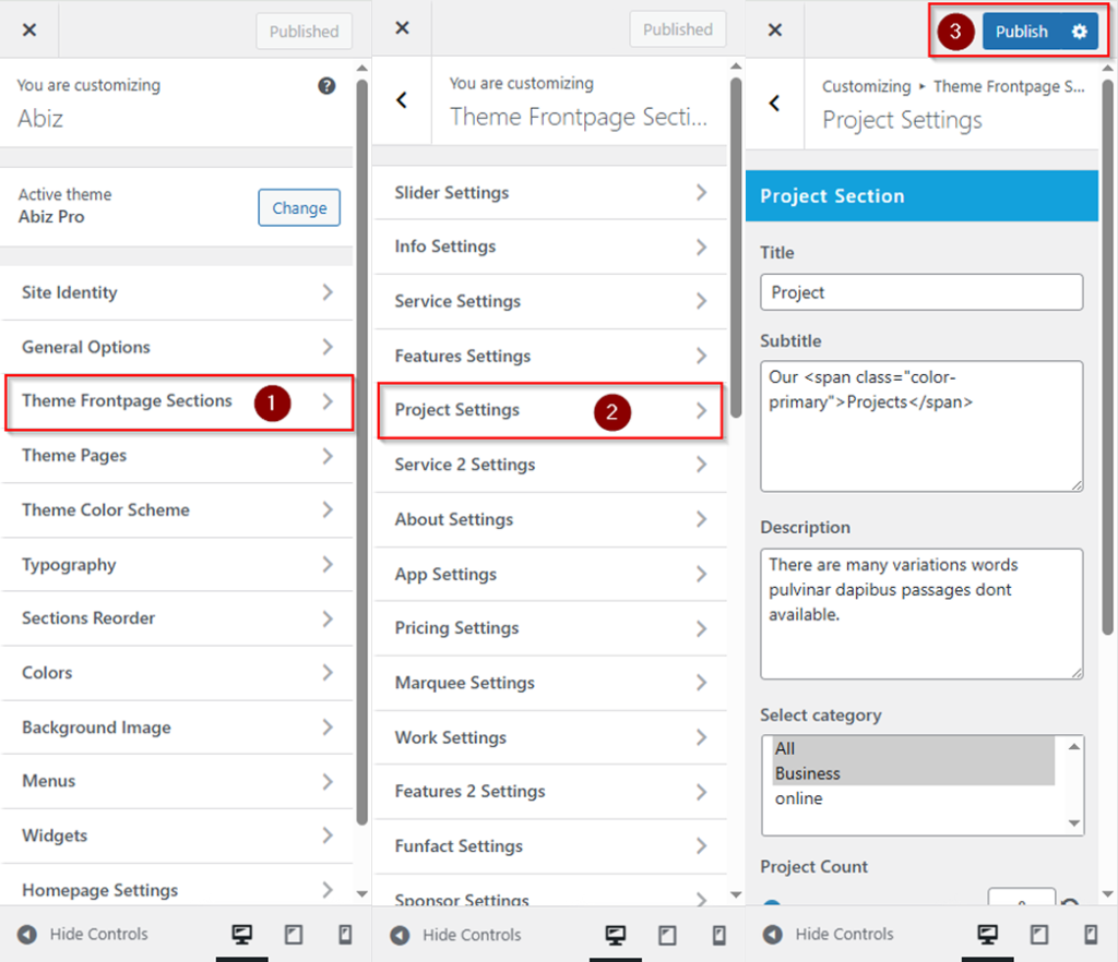 Log in to your WordPress Dashboard In the left-hand menu >> hover over Appearance and click on Customize >> look for the Theme Frontpage Sections option in the left-hand menu >> Under Project Settings >> then Publish button.