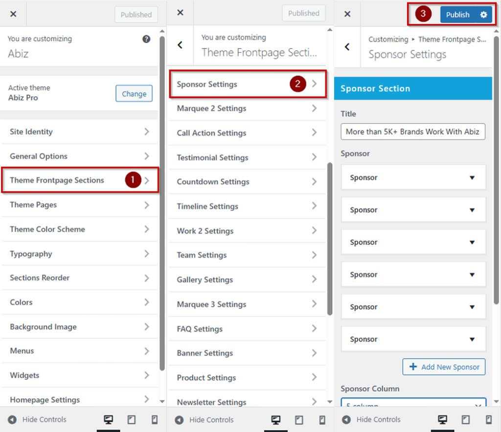 Log in to your WordPress Dashboard In the left-hand menu >> hover over Appearance and click on Customize >> look for the Theme Frontpage Sections option in the left-hand menu >> Under Sponsor Settings >> then Publish button.