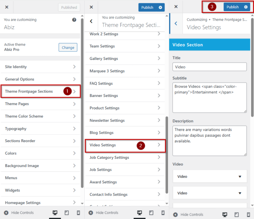 Log in to your WordPress Dashboard In the left-hand menu >> hover over Appearance and click on Customize >> look for the Theme Frontpage Sections option in the left-hand menu >> Under Video Settings >> then Publish button.