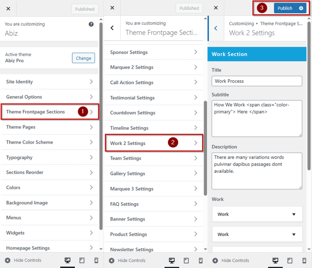 Log in to your WordPress Dashboard In the left-hand menu >> hover over Appearance and click on Customize >> look for the Theme Frontpage Sections option in the left-hand menu >> Under Work 2 Settings >> then Publish button.